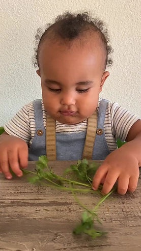 Niño de 1 meses, juega y saborea ramas de cilantro
